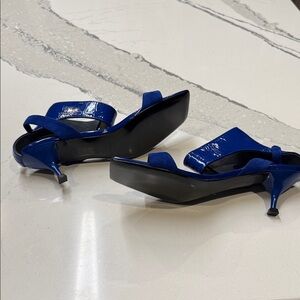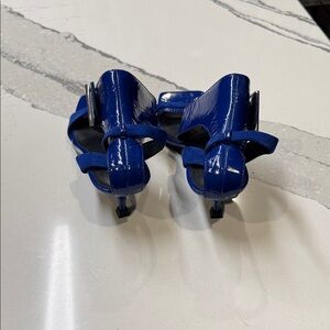 Chic blue heels with a glossy finish. Features a modern square toe and adjustable strap. Ideal for stylish outings. Reptile embossing. Never worn and no box.