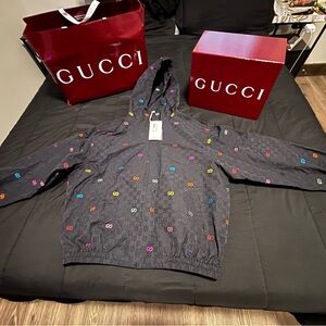 Stylish Gucci raincoat in black. Features multicolor logo design. Perfect for any weather.
