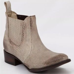 Cream beige snake reptile embossed boots from free bird. Distressed upper. Low heel. Pull strap on back. Chelsea style with stretch side gore. All leather construction. In preowned condition general wear, see all photos.