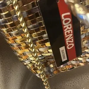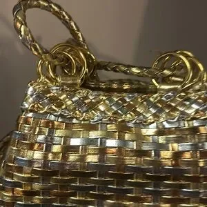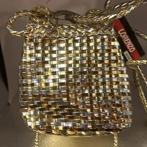 New with tags Crossbody. The name of the bag is LORENZO. The bag is woven with gold and silver. The hardware is gold. The dimensions of the bag is 8 inches wide and 7 1/2 inches long.