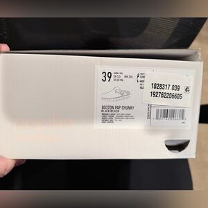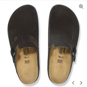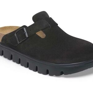 Stylish black mules with a secure strap. Features a comfortable cork footbed. Perfect for everyday wear.