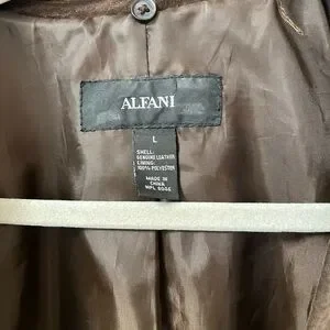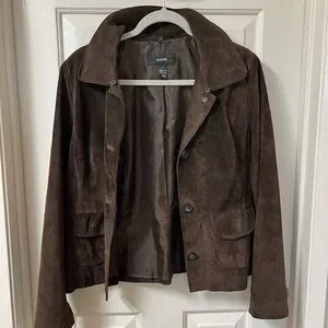Elegant dark brown leather jacket. Features button closure and sleek design.