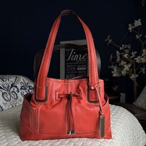 Tignanello Pebbled Orange Leather Shoulder bag. Open top with magnetic closure. Dual shoulder straps that have some peeling as shown in pictures. Has exterior pockets and four metal feet.