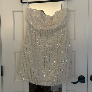 Lulus Luxe Mentality Ivory Tweed Sequin Strapless Lace-Up Mini Dress, Size Medium. Worn briefly for my bachelorette. In like-new condition. Out of stock at Lulus but still active on their site: https://www.lulus.com/products/luxe-mentality-ivory-tweed-sequin-strapless-lace-up-mini-dress/2323371.html