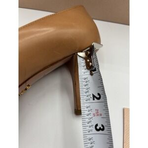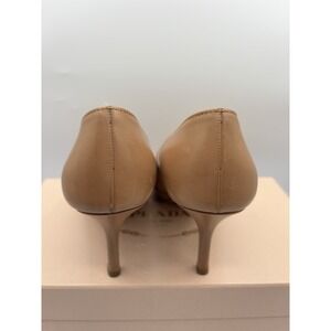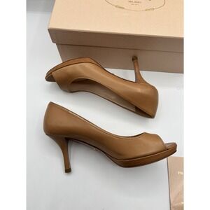 Elegant tan peep-toe heels by Prada. Perfect for any occasion.
