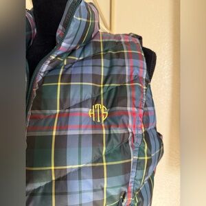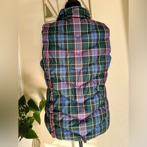 Stylish puffer vest with a multicolor plaid pattern. Features a front zipper and high collar. Perfect for layering.