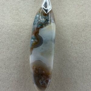 Natural ocean jasper stone on a stainless steel bail and 18” stainless steel chain. The pendant is 1 1/2” tall and 1/4” wide. It’s an irregular shape; long and thin. It has beautiful colors and patterns, including light pink, white, yellow and green. It has some agatization which adds to its unique features and depth. It could be worn to feature either side.