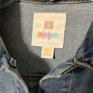 EUC LuLaRoe Harvey denim jacket—XXS. Light/medium wash with colorful Aztec/boho design on the back.