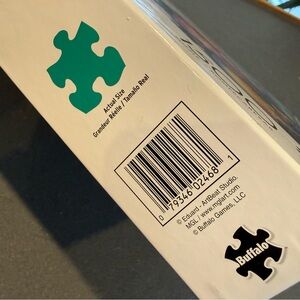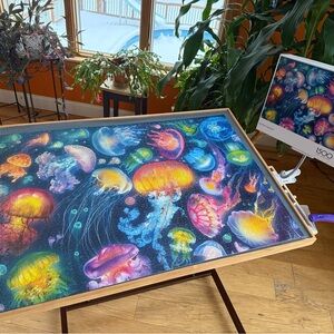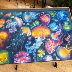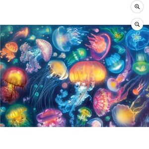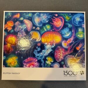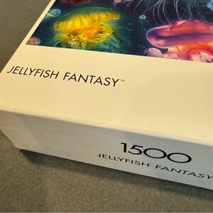 Buffalo David Bitton puzzle box with teal puzzle piece design. Beautiful jellyfish fantasy jigsaw puzzle by Buffalo, 1500 pieces, all pieces present. Super colorful and fun design with pink, yellow, green, blue, purple jellyfish against the dark ocean background. High-quality. As a bonus, I have separated all the edge pieces into their own baggie, enjoy this head start or mix them back in and separate them out yourself if that is your preference.