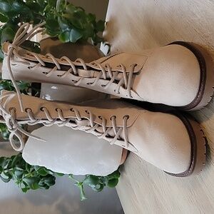 Sleek cream boots with lace-up front. Features convenient side zipper. Comfortable and stylish for everyday wear.