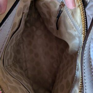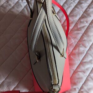 A Kate Spade icon! This is the classic "Maise" satchel from the popular Cedar Street collection. It features a durable Saffiano leather finish in a chic two-tone colorway: a neutral beige/greige top with a vibrant coral pink bottom. It’s the perfect structured bag that transitions easily from work to weekend.