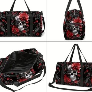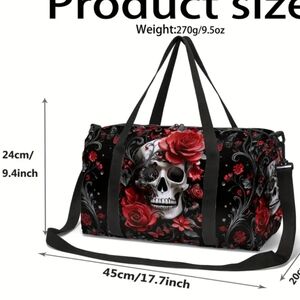Stylish duffel bag featuring a skull and roses design. Perfect for travel or gym use. Eye-catching and unique.
