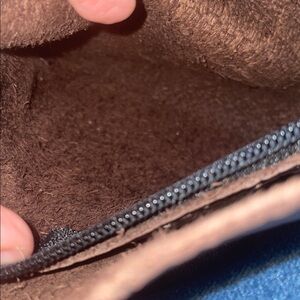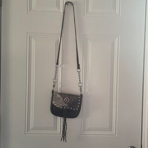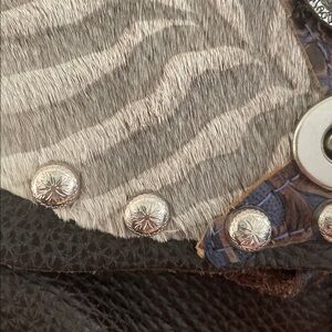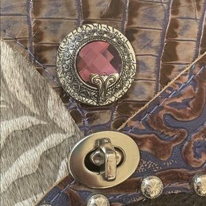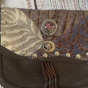 Featuring a handmade unique cream and dark brown design, this is a crossbody bag made from the Hip Company. The intricate details are unique with a rough cut leather design. The last 2 pictures up close for showing what I mean. Gives off a western/cowgirl vibe in great condition! The left side of the purse does show wear on the seams. It is made with authentic leather and has a purple stone placed in middle. Measurements in pics!