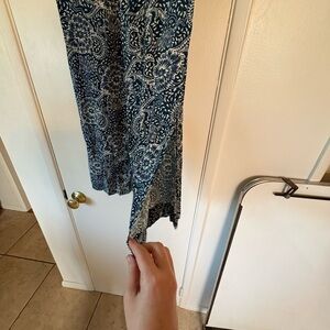 Chic pants with intricate blue and white floral design. Includes side slit at bottom of each leg. Ideal for any occasion.