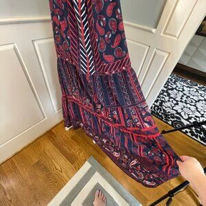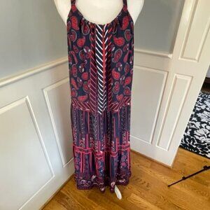 New with tags, Gibson Latimer Paisley stripe maxi dress in red, white and blue. Size XXL, fully lined, fixed straps, relaxed fit. Would work great as a swim cover up. Has oversized armholes for freedom of movement and may require a bandeau or other cami for coverage. 100% Polyester.