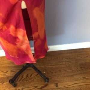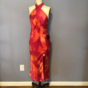 Chic pink and orange abstract print satin halter midi dress — perfect for weddings, parties, and special events. Features a sleek satin finish, halter neckline with button closures, and a crisscross bodice that creates a flattering silhouette. The column-style skirt falls to a midi length with a thigh-high front slit. Hidden back zipper and clasp. Lined. From a smoke-free home. Excellent condition.