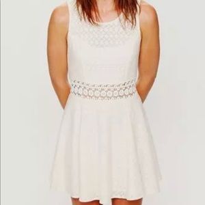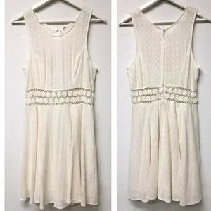 Texturized fit-n-flare tank mini dress with daisy chain cutout detailing around waist. Zips up the back.