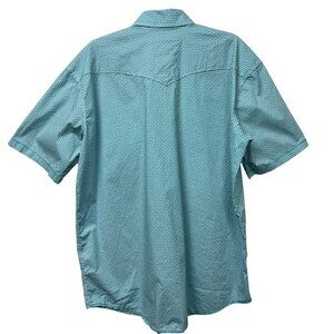 This men’s Panhandle Rough Stock short-sleeve western shirt features a blue micro geometric print with subtle turquoise undertones, giving it a clean solid-blue look from a distance and added visual interest up close. Classic western styling with dual chest pockets and a structured cut makes this an easy option for casual wear, western looks, or dressed-down outings.
