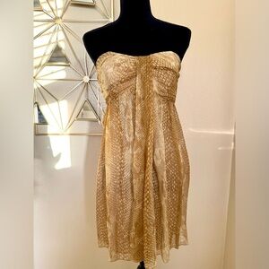 Chic strapless dress by Express. Features a shimmering gold hue. Perfect for elegant events.