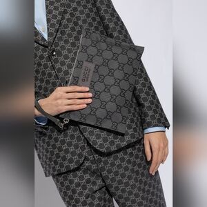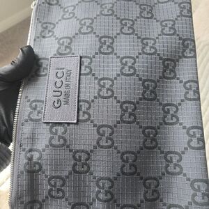 Authentic Gucci GG monogram ripstop pouch wristlet in gray technical fabric with leather trim. From the men’s collection but fully unisex. Sleek, modern, and versatile—perfect as a clutch, travel pouch, or everyday wristlet.