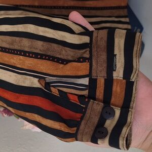 Stylish Vintage striped button-up shirt with long sleeves. Features a mix of brown, tan, and black stripes.