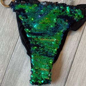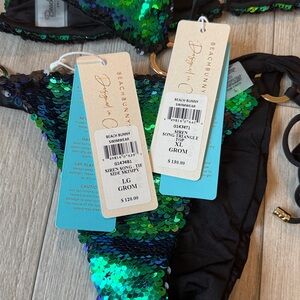 New with tags green ombré siren song Beach Bunny Bikini Set. Top is size XL. Bottom is size is Large. Colors are green, blue, and flat black on the flipped sequins side. I tried to photograph all colors the best I could, my lighting is just terrible today.
