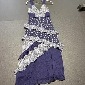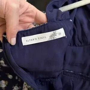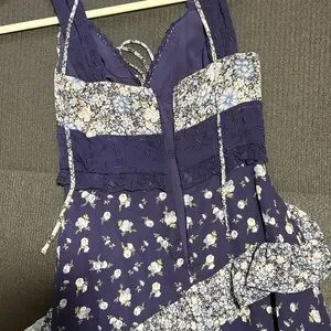 Only worn once! Chic navy dress with white floral accents. Ideal for any event. Zip back. Tie on back straps and front accent tie.