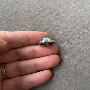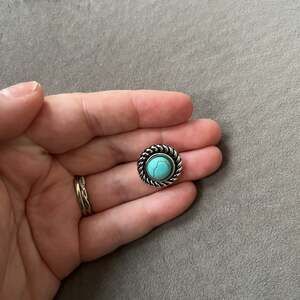 Authentic Ginger Snaps interchangeable jewelry button, Sunburst style with a faux turquoise center. This 18mm standard size snap features an intricate silver-tone rope/sunburst border, perfect for customizing your favorite snap bracelets, necklaces, or rings.