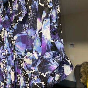 Style & Co. black and purple 1/2 sleeve button-up blouse featuring a sheer 100% nylon fabric, empire-like waist and sleeves that can be worn rolled up and buttoned. Clean and in excellent pre-worn condition