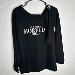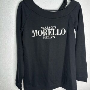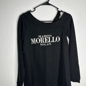Chic black long sleeve top by Frankie Morello. Features bold white lettering. Perfect for casual elegance.
