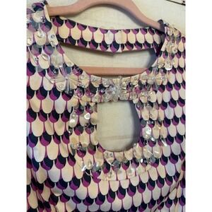 Nanette Lepore Beaded Keyhole Dress Purple White Geometric Print Sleeveless 12