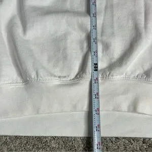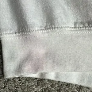 Great used condition. No holes, it looks like maybe a slight pink tint on the bottom corner of the sweatshirt. Please see pictures. Non-smoking home.