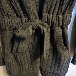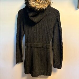 Woolrich Y2k Lambswool Long Cable Cardigan Zip Sweater Gray Hood Faux Fur Belt