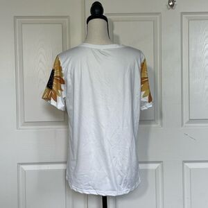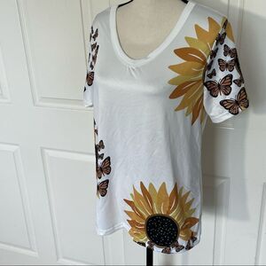 Newchic Sunflowers and Butterflies Cute V-Neck Short Sleeve Top Tee. White to off white top with gold, yellow, black and brown butterflies and sunflower detail. No fabric tag. From feel maybe a polyester blend that does provide some stretch. Approximate measurements are 25 length, 19 armpit to armpit and 8 sleeve length. NWOT. Size Large