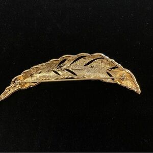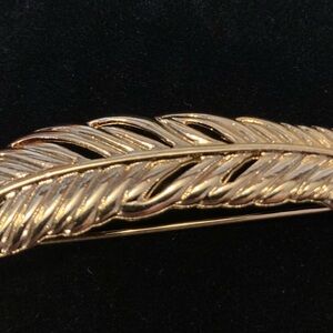 Elegant vintage Monet brooch in a curved feather design. Gold-tone finish with openwork detailing. Signed Monet on the back. Classic mid-century costume jewelry—timeless and easy to wear on coats, sweaters, or scarves. Very good vintage condition. Light, normal wear consistent with age. Approx 3.5” L.