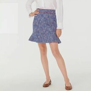 J. Crew Tweed Skirt in Autumn Tweed, a vibrant blue red and white multicolor pattern. This skirt features a flattering flounce hem and a classic silhouette. The quality fabric is made in Italy. The interior lining is a rich royal blue for added comfort and a polished finish. A red trim accents the waistband and hem for a pop of color.