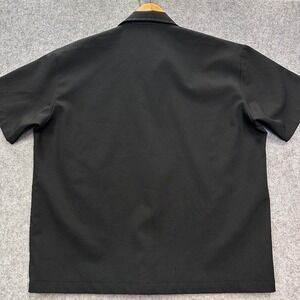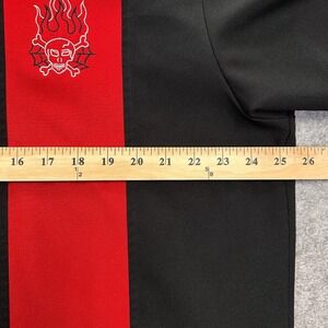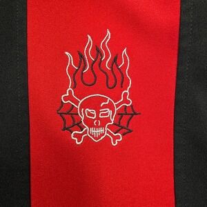 The Steady Last Call Shirt is a stylish men's XL black button-down shirt featuring a colorblock pattern with red skull and crossbones in flames, making it perfect for rockabilly and bowling enthusiasts. This short sleeve shirt has a collared neckline and button closure for a casual yet trendy look. Made of polyester woven fabric, it is machine washable and designed for a regular fit. Ideal for wearing in the summer, fall, or spring seasons, this shirt from the brand Steady adds a touch of edgy style to any man's wardrobe.