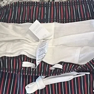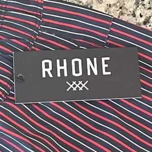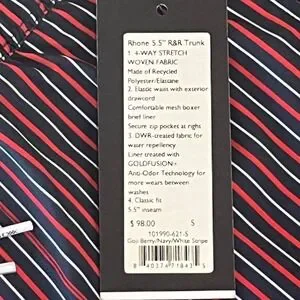 The NWT Rhone 5.5" R&R Swim Trunks in size S are a stylish and high-quality choice for men looking for swimwear. With a vibrant goji berry, navy, and white stripe design, these swim trunks offer both comfort and style. The brand, Rhone, ensures a reputable and reliable product that will make a statement at the beach or pool. Perfect for those who want to stand out and make a fashion statement while enjoying some fun in the sun.