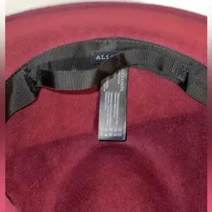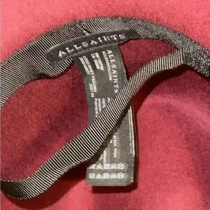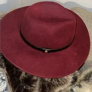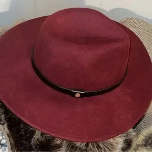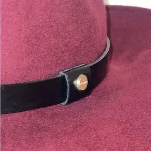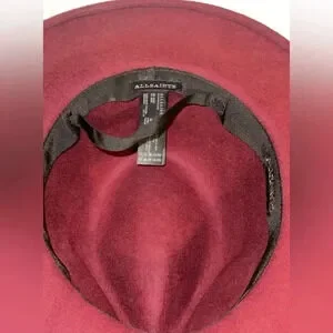 ALL SAINTS Designer Women’s 100% Wool Logo Rivet Lux Fedora Wide Brim Hat in Cherry Color