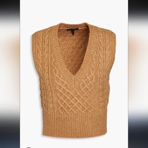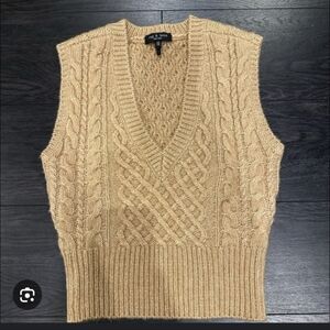 Rag & Bone Elizabeth cable-knit wool, cotton, and alpaca-blend sweater vest in the color tan or camel.
