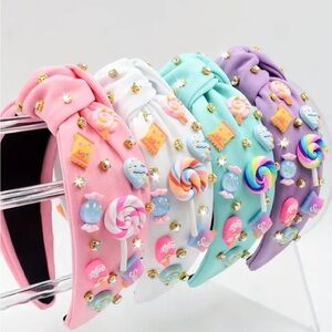 This adorable white headband features playful candy charms, perfect for adding a fun touch to any outfit.