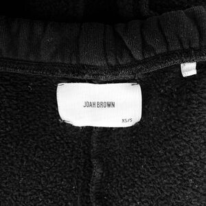 Joah Brown Empire Jogger in Black French Terry. Size XS/S. Inseam is 30 inches. Rise is 12 inches. Waist is 11.5 inches when laid flat. All measurements approximate. 100% Cotton. Excellent preowned condition. Features side pockets, fitted ankle bands, and an adjustable elastic waist.