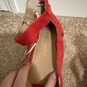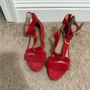 Bettye Muller Red Suede Sandals | Block Heel w/ Double Buckle & Zip | 1.5” Heel