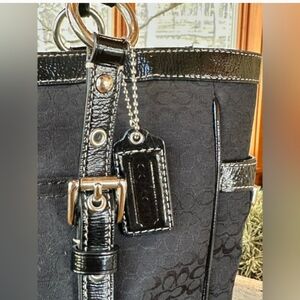 COACH BLACK VINTAGE SIGNATURE CARRY ALL TOTE in BLACK MONOGRAM JACQUARD WITH PATENT LEATHER TRIM and BUCKLE DETAILS. DOUBLE SHOULDER STRAPS WITH ZIP. LOTS OF INTERIOR ORGANIZATION. COMES WITH COACH HANG TAG