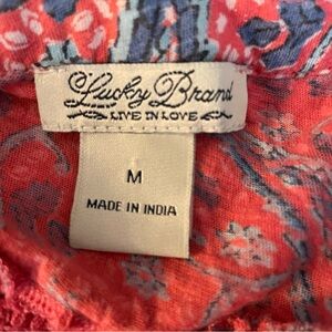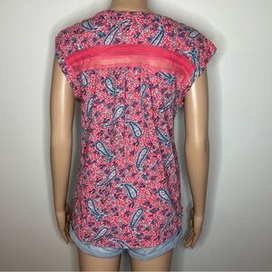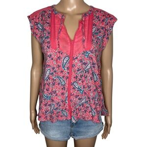 Lucky Brand Pink Blue Floral V-Neck Lace Detail Short Sleeve Paisley Blouse Top