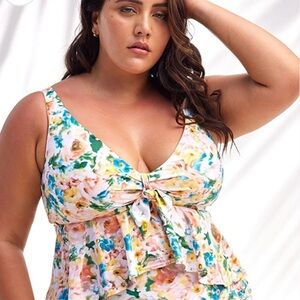 A flirty tie-front detail defines this ruffled tankini top featuring supportive powermesh for a sculpted fit and splashed with a blooming print.