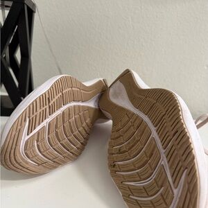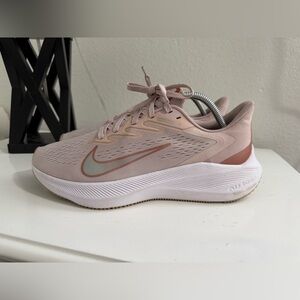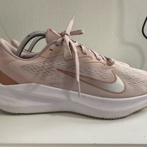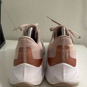 Sleek Nike shoes with a blush upper and gold accents. Perfect for active lifestyles.