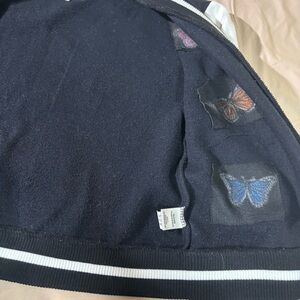 Stylish black and white cardigan featuring colorful butterfly embroidery. Perfect for adding a whimsical touch to your outfit.