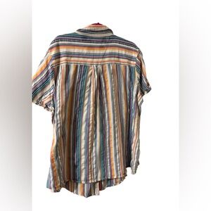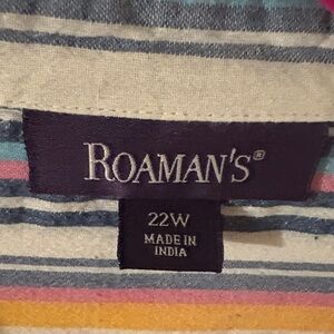 Chic blouse with vibrant stripes. Features button-up front and short sleeves. Perfect for a lively style. Size 22W by Roaman’s.