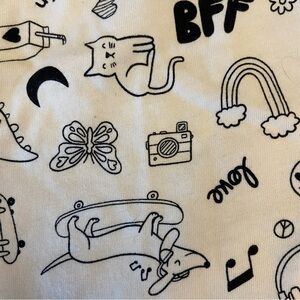 • Yellow dress with doodle print (cats, hearts, “BFF,” and more)